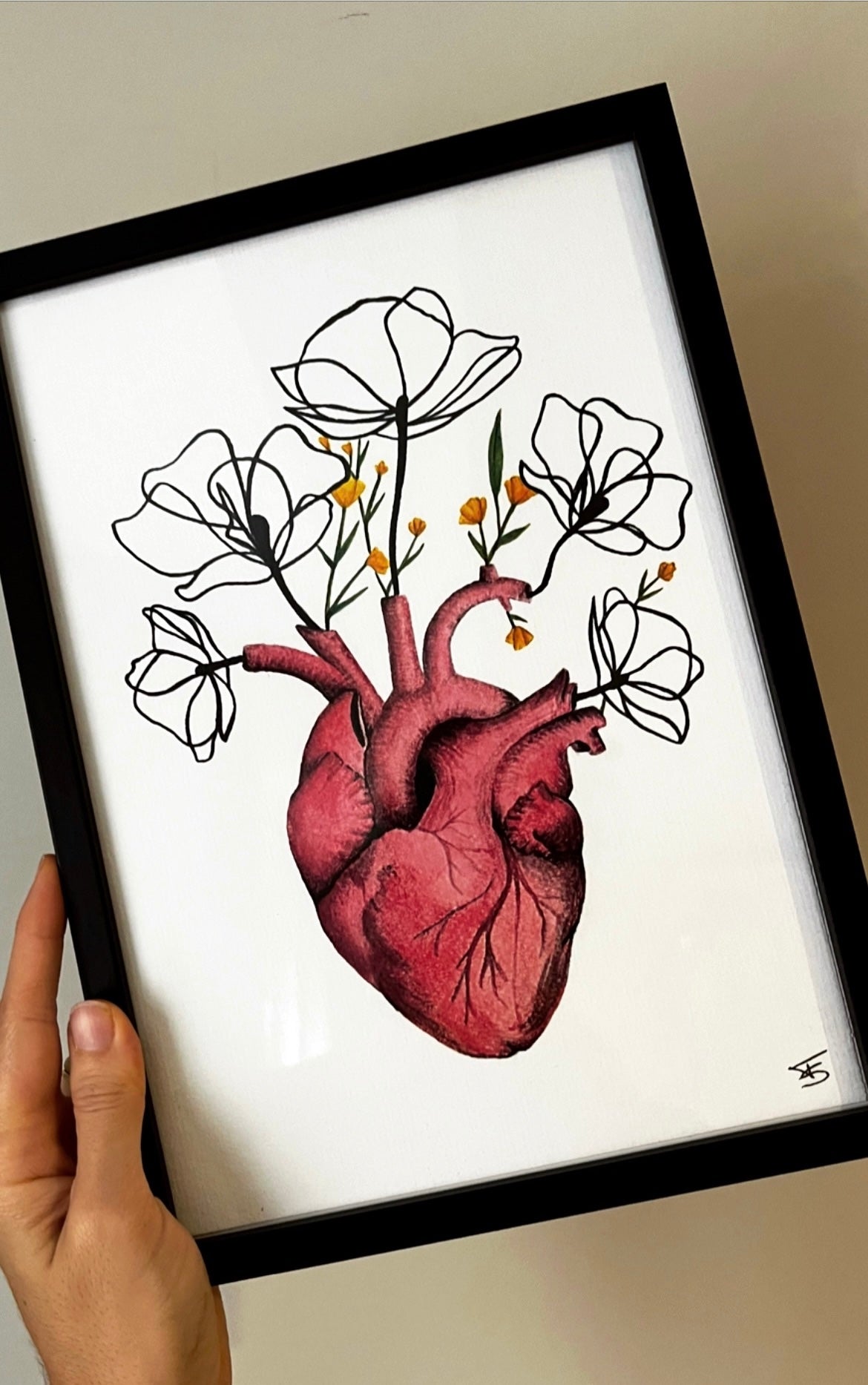 Una ilustración donde la anatomía y la naturaleza se encuentran. En este diseño minimalista en tonos grisáceos, un corazón anatómico florece, fusionando la belleza de lo orgánico con la emoción humana.