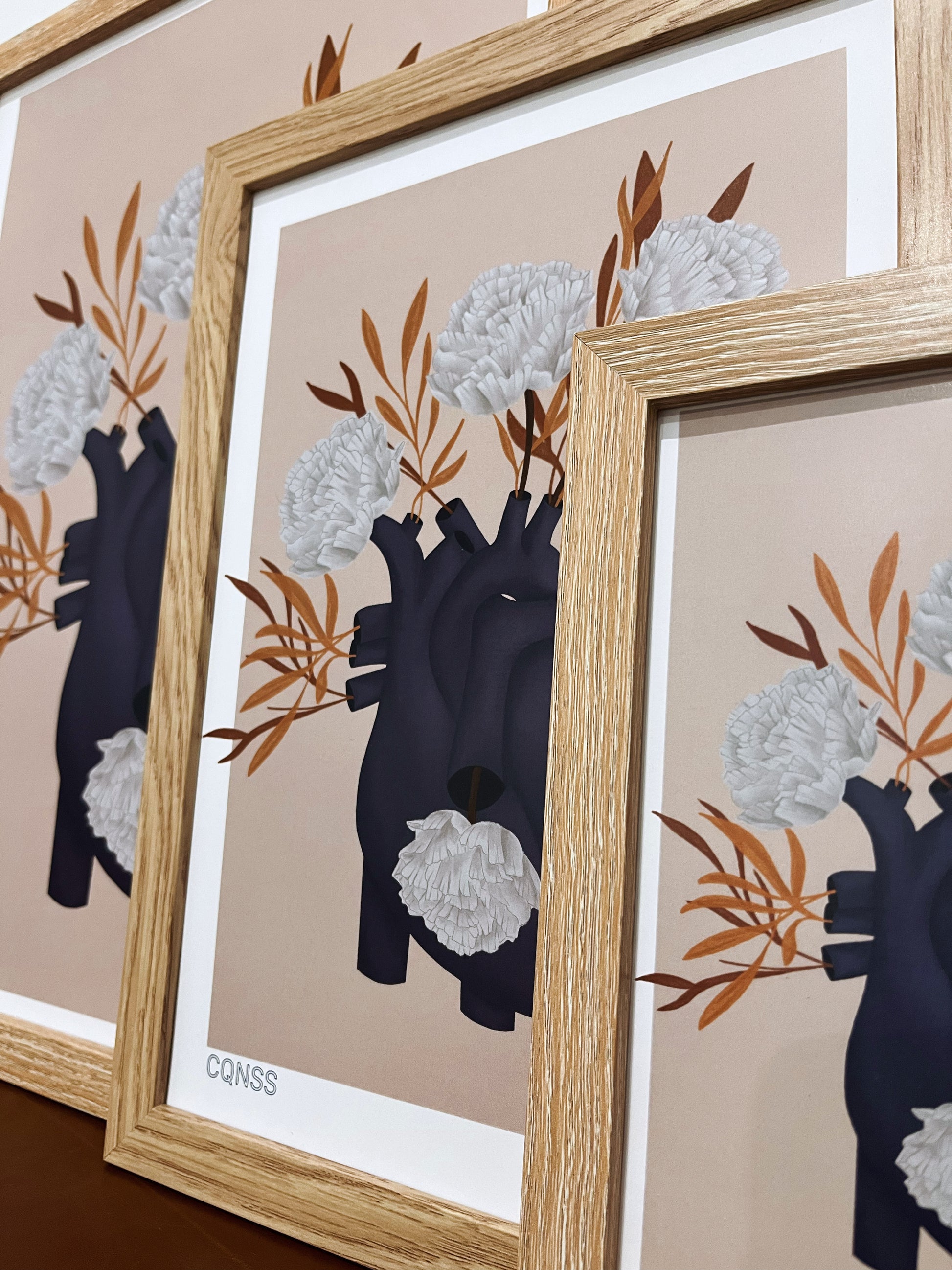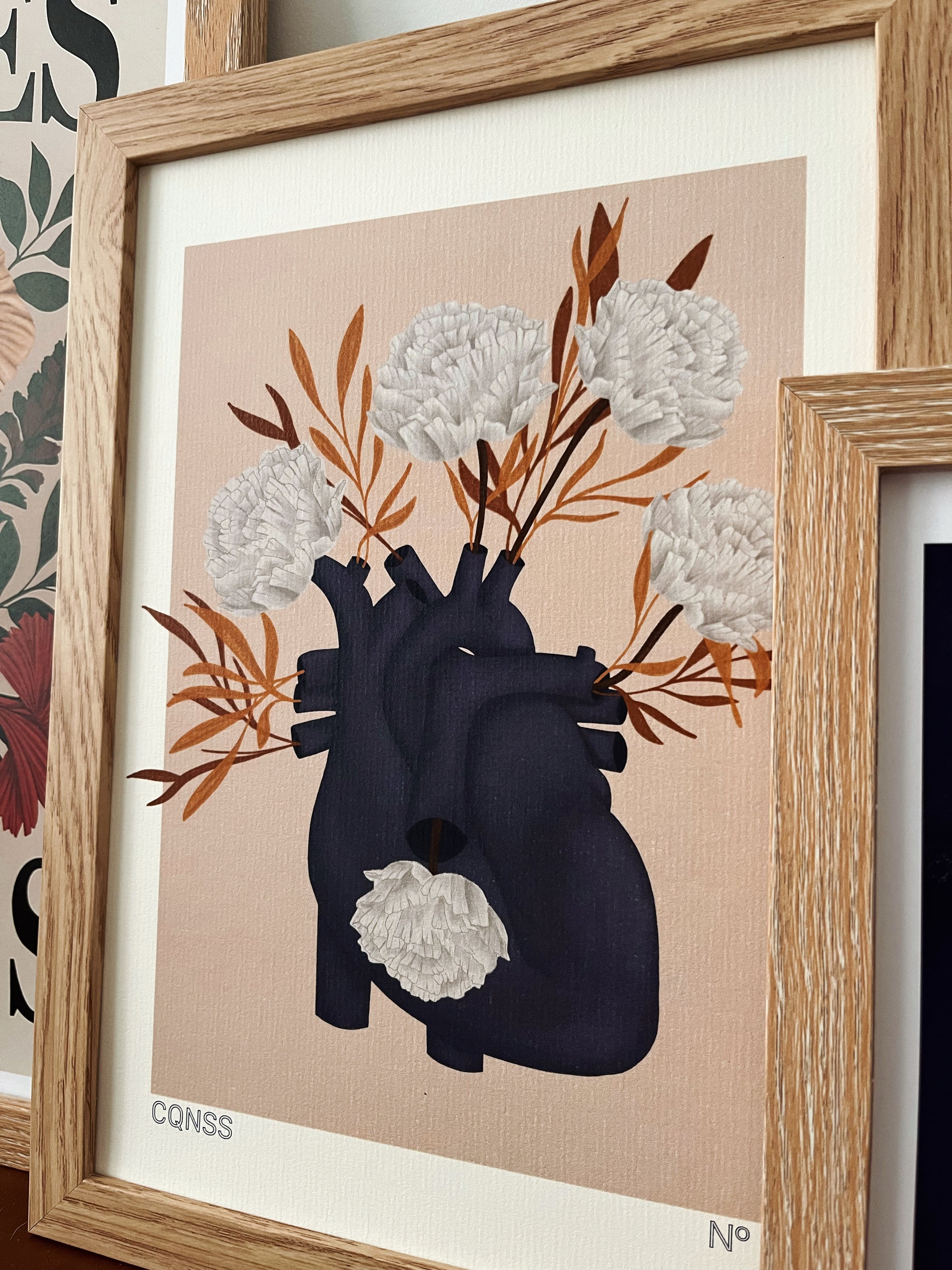 Corazón que no sabe sufrir N 6 (CQNSS), una ilustración donde la anatomía y la naturaleza se encuentran. En este diseño un corazón anatómico florece, fusionando la belleza de lo orgánico con la emoción humana.