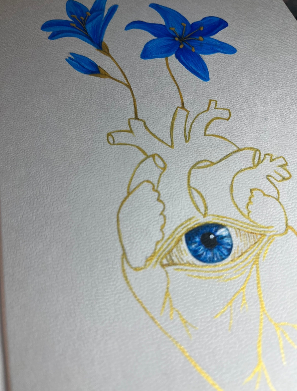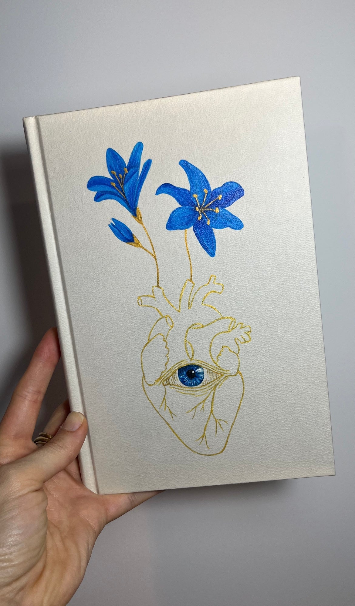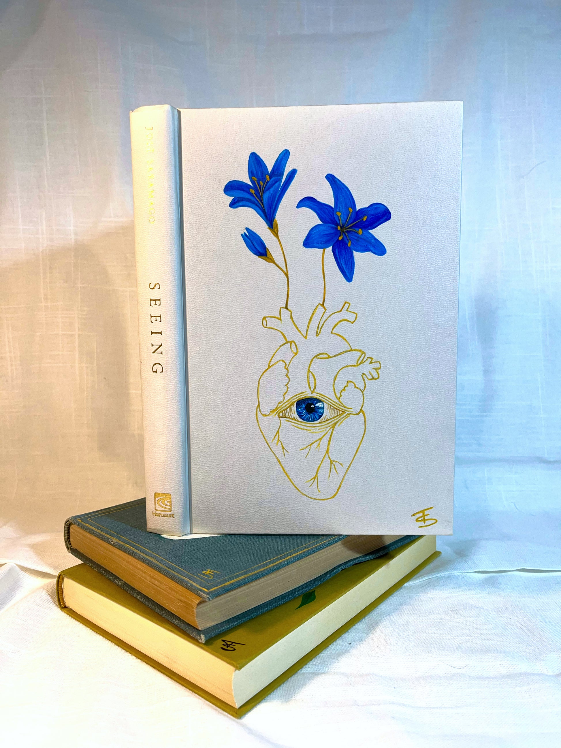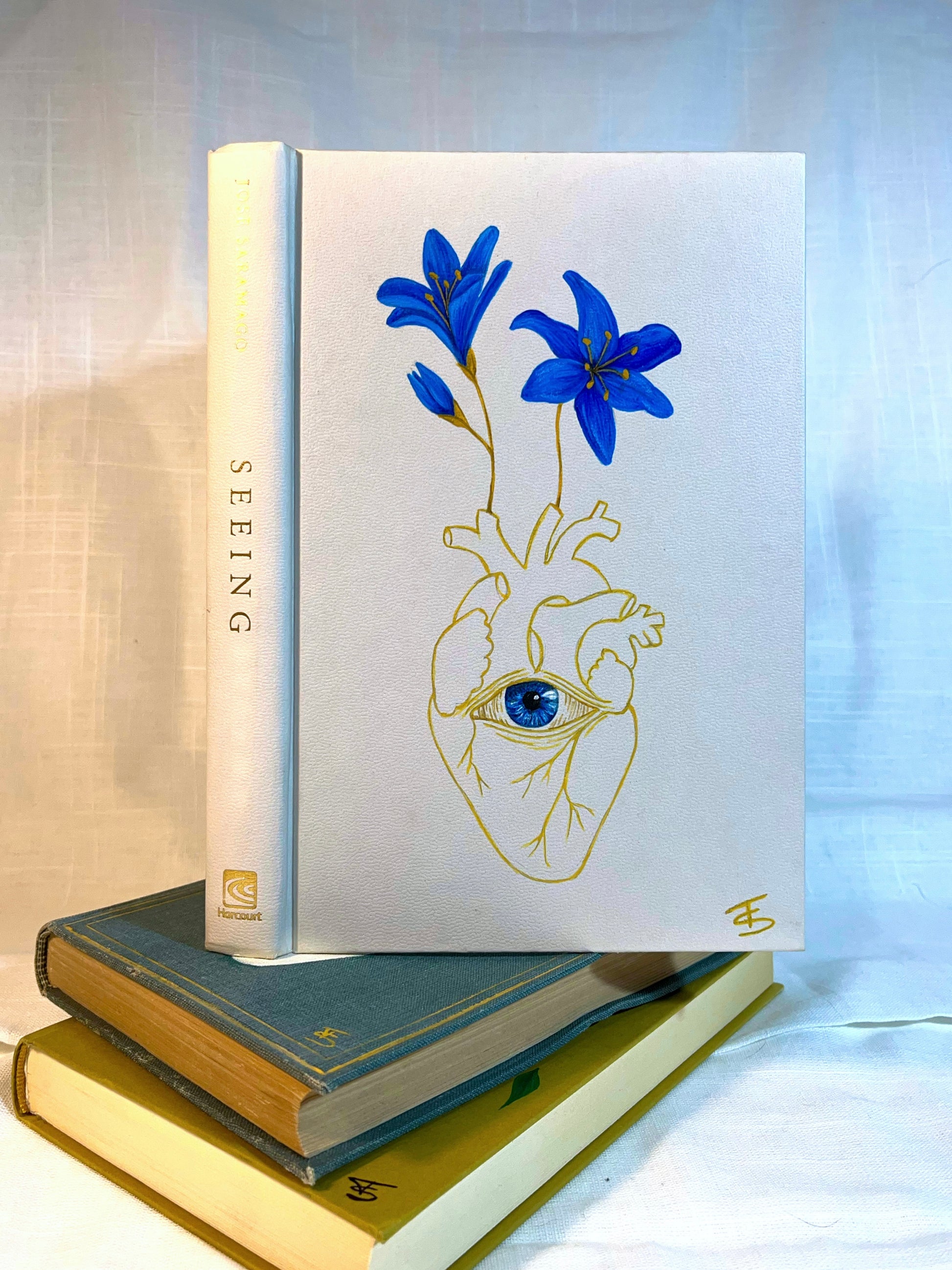 Este ejemplar de segunda mano de Seeing (Ensayo sobre la lucidez), de José Saramago, ha sido transformado en una pieza única. La portada, pintada a mano, reinterpreta visualmente la profundidad y el simbolismo de esta impactante novela.